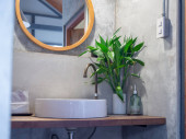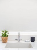 Zdjęcie "Oczyścić wnętrze biały łazienka umywalka bateria umywalkowa, kwiat w splot Pot, mydło i Kubek ceramiczny. Nowoczesny Design łazienki z miejsca kopii." może być wykorzystywane do celów osobistych i komercyjnych zgodnie z warunkami zakupionej licencji Royalty-free. Obraz jest dostępny do pobrania w jakości wysokiej rozdzielczości do 5760x3840.