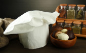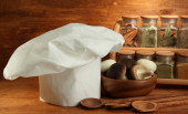 Kucharski kapelusik z łyżki na stole w kuchni