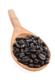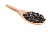 czarna fasola w drewnianą łyżką na białe tło widok z góry