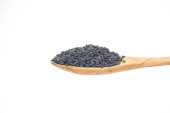 czarna fasola w drewnianą łyżką na białe tło widok z góry