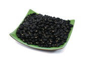 czarna fasola z drewnianą łyżką i w Pucharze zbliżenie na białym tle