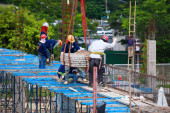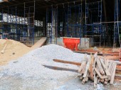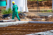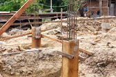 pręt stalowy, żelazo na budowie jest rdza na ziemi i robotnika: Wybierz ostrość z płytką głębią ostrości.