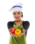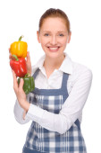 Młoda kobieta pracownika supermarketu lub detalicznej oferuje świeże warzywa jako zdrowe pomidory i papryka reklamy koncepcja na białym tle na biały koncepcja