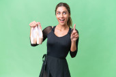 Młoda kobieta supermarket lub pracownika detalicznych oferujących mięsa mrożonego produktu jako towar reklamy koncepcja na białym tle