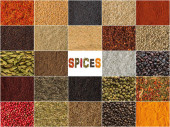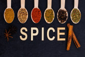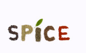 Czcionka tytułu przyprawa z różnorodnych przypraw zdjęcie na białym tle. Kolaż z przyprawami. Składniki ziół i przypraw