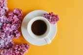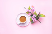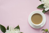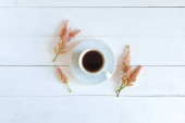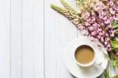 Martwa natura z filiżanką kawy i Wilcza kwiaty na stół drewniany