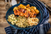 Shish kebab z pieczonymi ziemniakami i trzy rodzaje sałatek. Widok z góry.