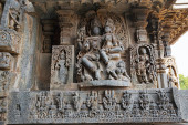 Relieif w ozdobny dolny i rzeźby hinduskich bóstw, Świątynia Kedareshwara, Halebid, Karnataka, Indie.