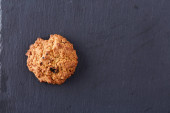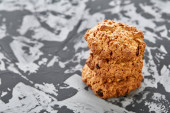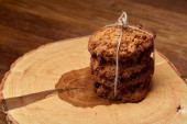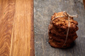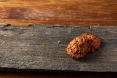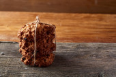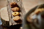 Masa orzechowa na okrągłe kłoda drewna nad rustykalne drewniane tła, zbliżenie, Selektywny fokus.