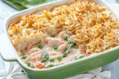 Zapiekanka z łososia, ziemniaki, szparagi, groszkiem i sosem śmietanowym