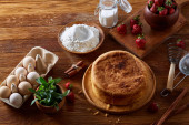 Pyszne ciasto z świeże truskawki ekologiczne na deska do krojenia na podłoże drewniane, szczegół, żarówce(-ach) ostrości.