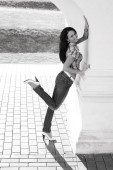 Niesamowite modelu african american Kobieta w zielone spodnie i czarny kapelusz, jakie odkryty przeciwko hali, skakać w powietrze.