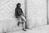 Niesamowite modelu african american Kobieta w zielone spodnie i czarny kapelusz stwarzane na ławce.