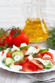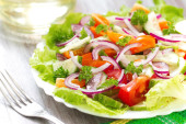 Świeże sałatki witth pomidory i cebula wiosna na talerzu. Wegańskie