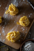Zdjęcie "Makaron RAW tagliatelle na drewnianą deską do krojenia. Ręcznie robione Włoskie makarony tradycyjne." może być wykorzystywane do celów osobistych i komercyjnych zgodnie z warunkami zakupionej licencji Royalty-free. Obraz jest dostępny do pobrania w jakości wysokiej rozdzielczości do 5760x3840.
