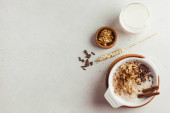 Multigrain zbożowy płatki w misce niebieskie szkło, Dzbanek mleka, przyprawy (gałki muszkatołowej i cynamonu) i orzechy włoskie. Składnik do przygotowania zdrowe śniadanie. Koncepcja zdrowej żywności. Kopiować miejsca na tekst.