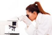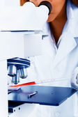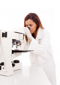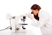 kobieta naukowiec patrząc przez Mikroskop, na białym tle