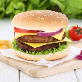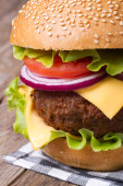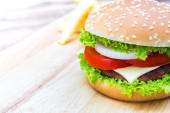 Hamburger z kotlet z mięsa i ketchupem na płyty drewniane