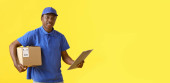 Afryki amerykański dostawę człowieka przewozu paczek i przedstawiania formularz odbioru
