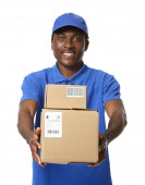 Zdjęcie "Afryki amerykański dostawę człowieka przewozu paczek i przedstawiania formularz odbioru" może być wykorzystywane do celów osobistych i komercyjnych zgodnie z warunkami zakupionej licencji Royalty-free. Obraz jest dostępny do pobrania w jakości wysokiej rozdzielczości do 5760x3840.