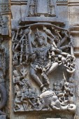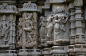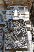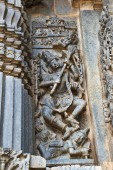 Kwiecisty wall panel płaskorzeźby przedstawiające Kamdev i jego żona Rati, Kedareshwara temple, Halebidu, Karnataka, Indie.