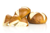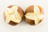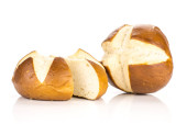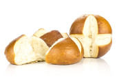 Bawarskie chleb bun jednego cięcia w dwie połówki na białym tle na białym tle świeże pieczone loave w plasterkach