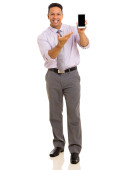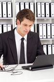 zmęczony mężczyzna urzędniczka z wielu gadżetów wokół niego