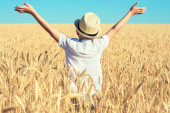 Szczęśliwa rodzina. Kobieta i mężczyzna patrząc na słońce. Ciesz się na polu pszenicy. Widok z tyłu.