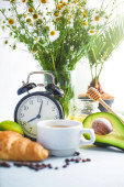 Poranna kawa w filiżance biały rogalik na jasnym tle Wake-up z budzikiem śniadanie wesołość, zdrowy śniadanie świeżość płaskim leżał kopii spase