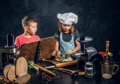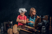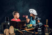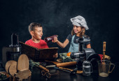Zdjęcie "Kilka cute kucharz. Mały chłopiec z brązowe, kręcone włosy, ubrany w niebieski kucharz uczennica jednolite i piękne ubranych w jednolite różowe kucharz, pozach z naczynia i owoce w studiu. Na ciemnym tle z teksturą tle." może być wykorzystywane do celów osobistych i komercyjnych zgodnie z warunkami zakupionej licencji Royalty-free. Obraz jest dostępny do pobrania w jakości wysokiej rozdzielczości do 5760x3840.