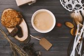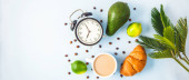 rano śniadanie, Kawa w filiżance biały rogalik awokado przebudzenie z budzikiem wesoła, zdrowy śniadanie świeży widok z góry kopia miejsce