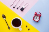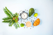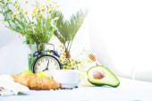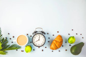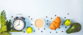 rano śniadanie, Kawa w filiżance biały rogalik awokado przebudzenie z budzikiem wesoła, zdrowy śniadanie świeży widok z góry kopia miejsce.