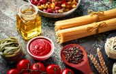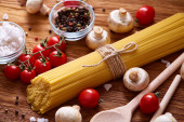 Włoskie pochodzenie żywności z różnych rodzajów makaronu, zdrowia lub koncepcji wegetariańskiej. Widok z góry z miejsca kopiowania.