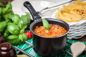 Makaron, sos bolognese i bazylia na drewnianym stole.