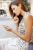 bliska portret interesu za pomocą cyfrowego tabletu stojąc obok niektórych łuki w mieście.