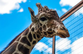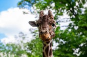 Zdjęcie "Żyrafa widok od strony przeciw błękitne niebo i zielone drzewa." może być wykorzystywane do celów osobistych i komercyjnych zgodnie z warunkami zakupionej licencji Royalty-free. Obraz jest dostępny do pobrania w jakości wysokiej rozdzielczości do 5760x3840.