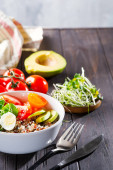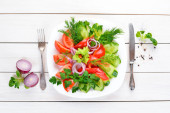 Zdjęcie "Zdrowa Sałatka płyty z orange, orzech, Sałatka i ogórek, pomidor, rzodkiewka z chińskim makaronem i marchew na tle kamień leżał płaski. Żywności i zdrowia. Czyste, jedzenie." może być wykorzystywane do celów osobistych i komercyjnych zgodnie z warunkami zakupionej licencji Royalty-free. Obraz jest dostępny do pobrania w jakości wysokiej rozdzielczości do 5760x3840.