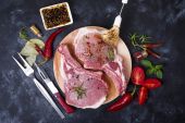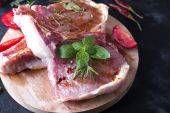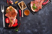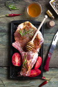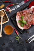 Wybór marynowane mięso do grillowania w wyświetlacz grilla serwujemy plasterek z warzywami i miód na ciemnym tle betonowych