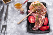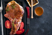 Zdjęcie "Wybór marynowane mięso do grillowania w wyświetlacz grilla serwujemy plasterek z warzywami i miód na ciemnym tle betonowych" może być wykorzystywane do celów osobistych i komercyjnych zgodnie z warunkami zakupionej licencji Royalty-free. Obraz jest dostępny do pobrania w jakości wysokiej rozdzielczości do 5760x3840.