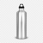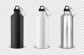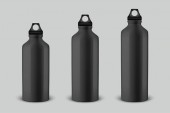 Wektor realistyczny 3d czarny pusty błyszczący metal butelka na wodę z zbliżenie bung czarny na białym na białym tle. Zaprojektuj szablon makiety opakowań dla grafiki. Widok z przodu