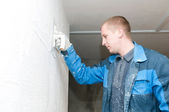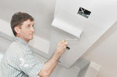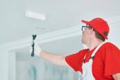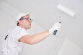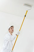 Malarstwo. Malarz z farby roller krycia sufitu białą farbą