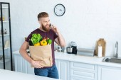przystojny młody człowiek uśmiechający się trzyma worek spożywczy z warzywami i odwracając w kuchni