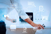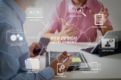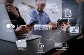 Rozwój technologii programowania i kodowania projektowanie wirtualne diagramie. Biznesmeni, pracujących razem nad dokumentem i za pomocą smart telefonu i cyfrowy tablet i laptop komputer w nowoczesnym biurze