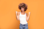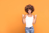 Co się sukcesem! Piękny szczęśliwy african american kobieta świętuje zwycięstwo, pozowanie na żółtym tle. Pozytywne emocje.