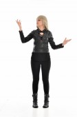 Pełna długość Portret blondynka na sobie czarne skórzane ubrania, stojąc poza. na białym tle na tle białego studia.