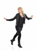 Pełna długość Portret blondynka na sobie czarne skórzane ubrania, stojąc poza. na białym tle na tle białego studia.