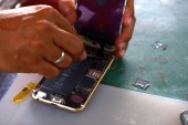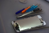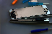 Narzędzia i sprzęt do naprawy i rozpakowaniu mobilnych phones.technician naprawianie uszkodzony telefon komórkowy upclose zbliżenie z A ludzka ręka naprawy Smartphone z Screwdriverinternal układy i elementy konstrukcyjne telefonów komórkowych