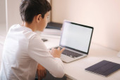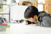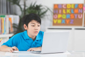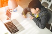 Ładny chłopiec azjatyckich za pomocą komputera przenośnego.