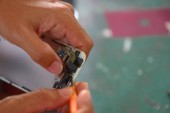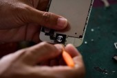 Zbliżenie z A ludzka ręka naprawy Smartphone z Screwdriver.Internal układy i elementy konstrukcyjne telefonów komórkowych. Naprawa telefonów komórkowych i tabletów przez wykwalifikowanych techników. Doświadczonych testerów i check telefonów. Przed i po naprawie