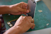 Zdjęcie "Zbliżenie z A ludzka ręka naprawy Smartphone z Screwdriver.Internal układy i elementy konstrukcyjne telefonów komórkowych. Naprawa telefonów komórkowych i tabletów przez wykwalifikowanych techników. Doświadczonych testerów i check telefonów. Przed i po naprawie" może być wykorzystywane do celów osobistych i komercyjnych zgodnie z warunkami zakupionej licencji Royalty-free. Obraz jest dostępny do pobrania w jakości wysokiej rozdzielczości do 5760x3840.